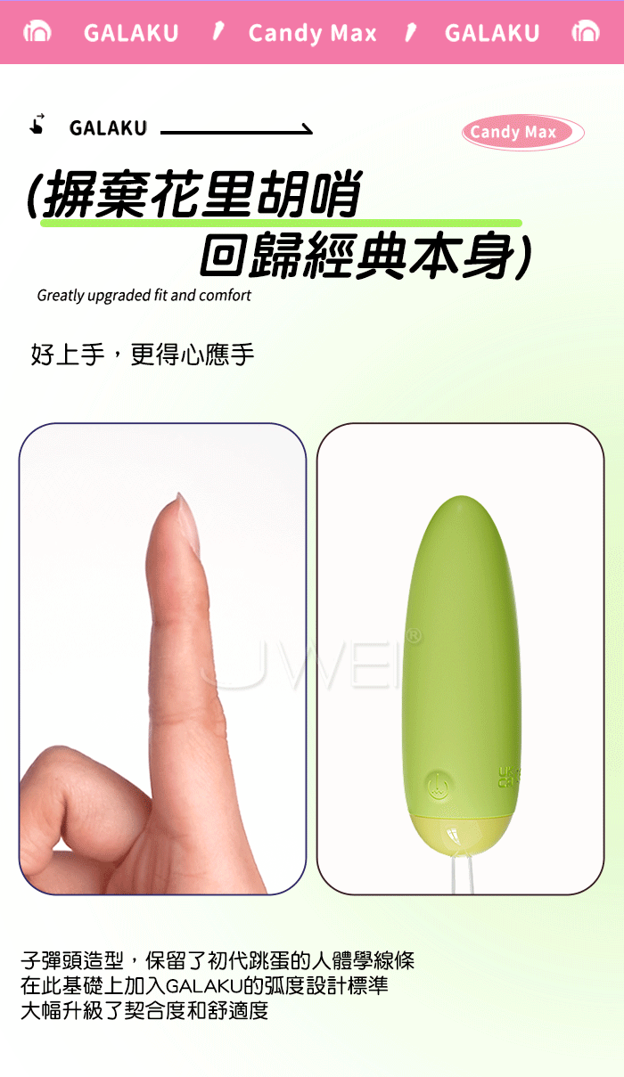 ►您現在的位置:首頁>GALAKU.跳跳糖 10頻爆跳穿透強震 深肌快感 加厚矽膠變頻跳蛋【AI智控款-綠色】