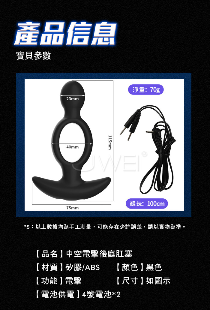 電撃刺激中空肛塞,電波滲透表面,直擊深處神經 10級強度調節,圓潤光滑牢固貼合股溝 產品規格 ■尺寸: 大小詳如圖片標示 ■材質: 矽膠+ABS ■供電方式: 4號電池x2 ■特色:10級電流強度、自由調整