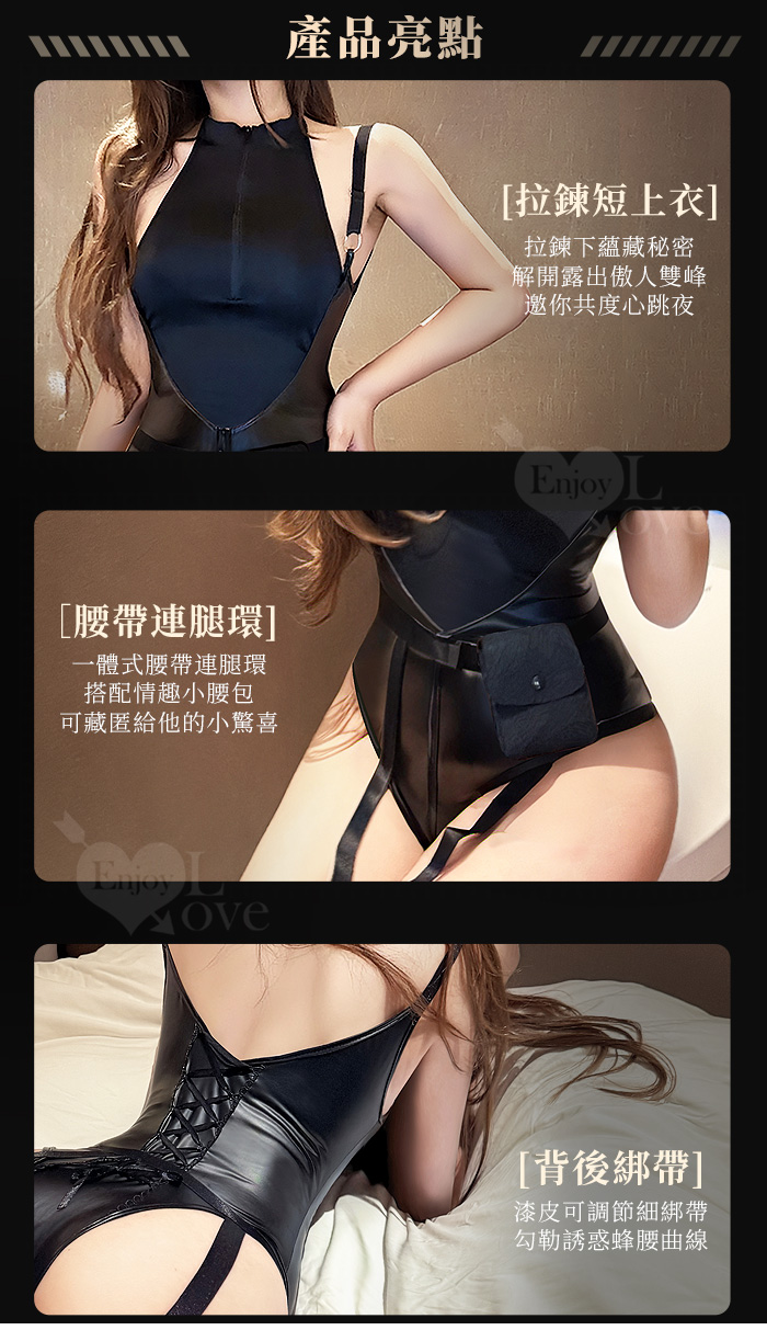 ►您現在的位置:首頁>酷感削肩漆皮連身衣|拉鍊開合設計+可拆腰帶腿環四件式套裝