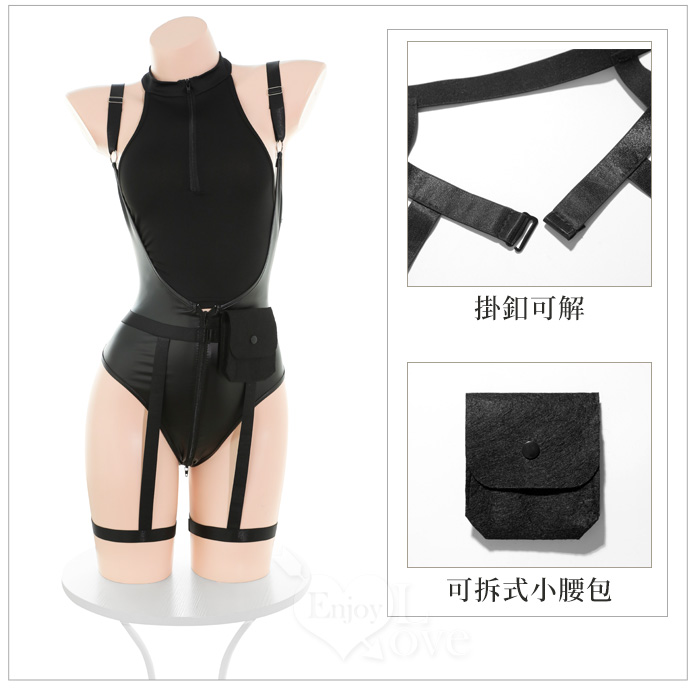 | 酷感削肩漆皮連身衣|拉鍊開合設計+可拆腰帶腿環四件式套裝