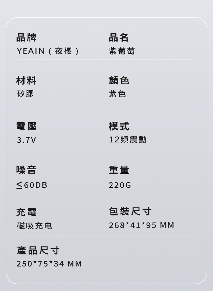 ►您現在的位置:首頁>夜櫻YEAIN 紫葡萄 12段變頻多點觸入USB充電震動按摩棒