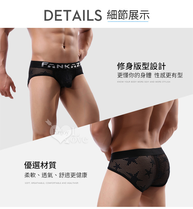 ►您現在的位置:首頁>《 Enjoy Love 》星星網眼U凸囊袋低腰鏤空內褲 - 黑﹝XL﹞
