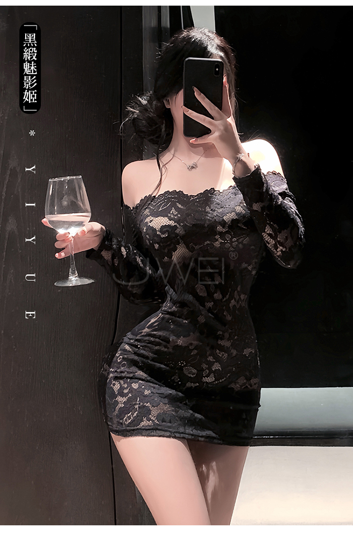 | 花蔓朦朧.蕾絲雕花一字領透視包臀睡裙【連身裙+T褲+隱形肩帶-黑色】