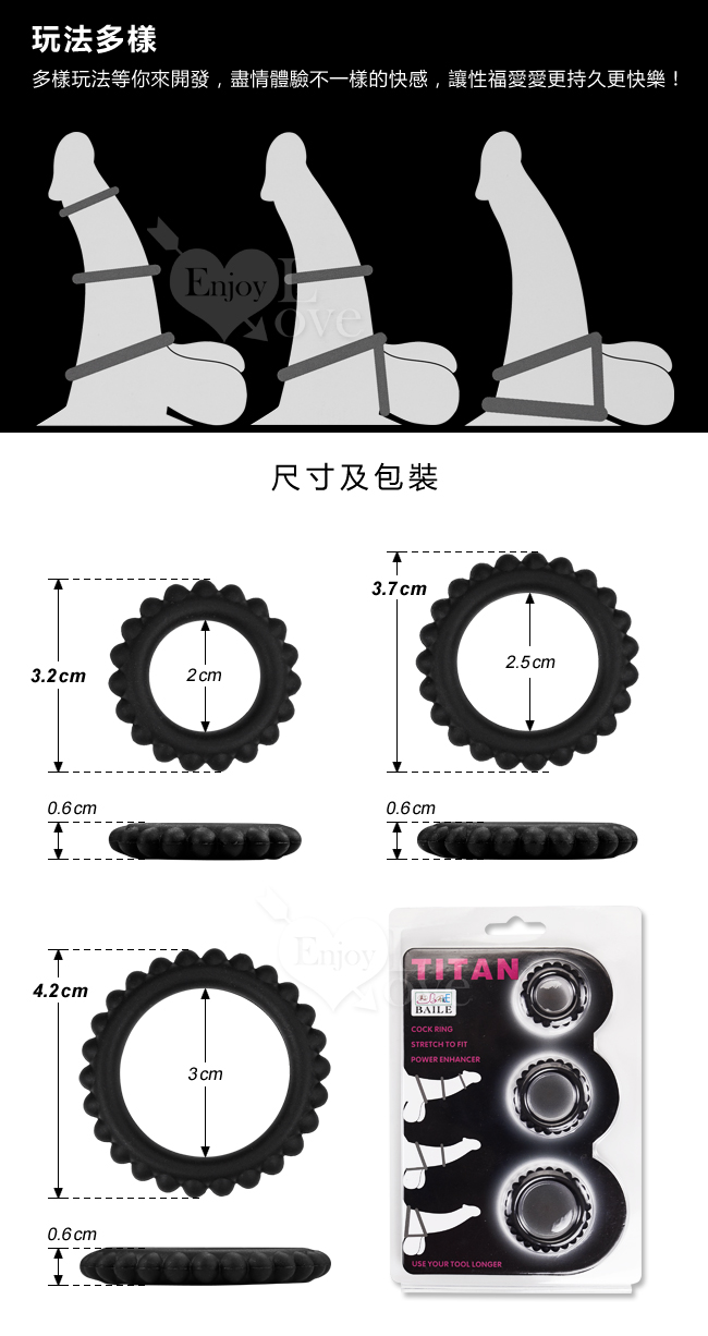 說明: 使用高級無毒安全矽膠製成,柔軟富有彈性,觸感柔細舒服軟硬度適中, 造型特殊,精美的包裝設計也非常適合拿來送禮用哦。 能讓你發揮最佳的戰鬥能力,享受長時間猛烈衝撞的飆速快感。 一組有3個不同大小的環,內直徑各為2公分、2.5公分、3公分。 將它套於勃起的陰莖根部也能連蛋蛋一起套,能夠保持堅固, 滿足女性生理需要,增加你的忍耐力,讓人刮目相看,而且很炫、雄壯威武。
