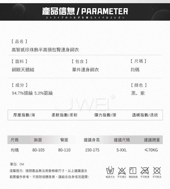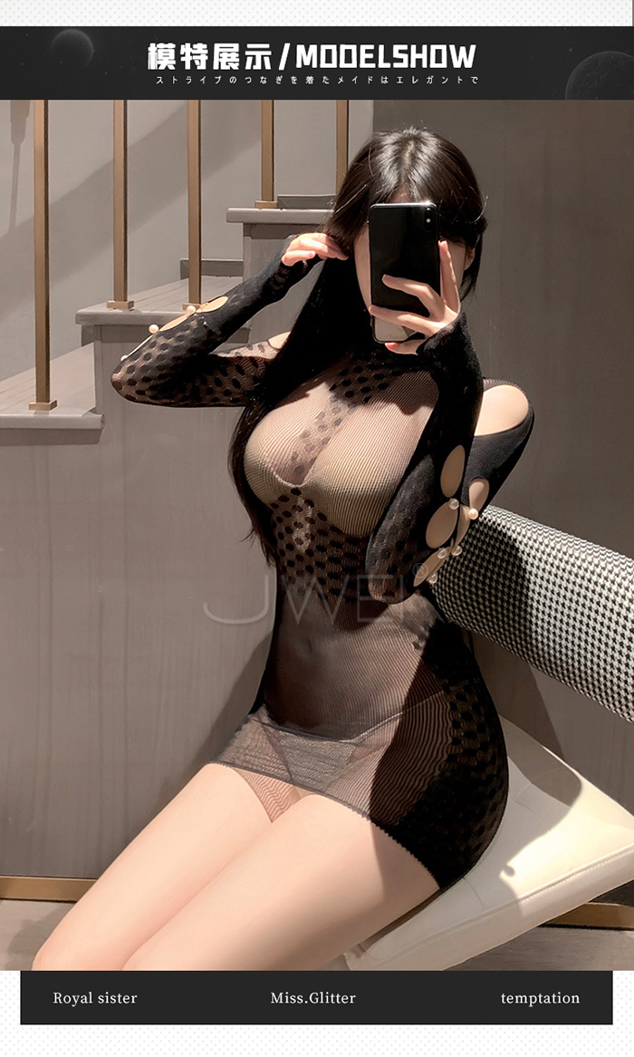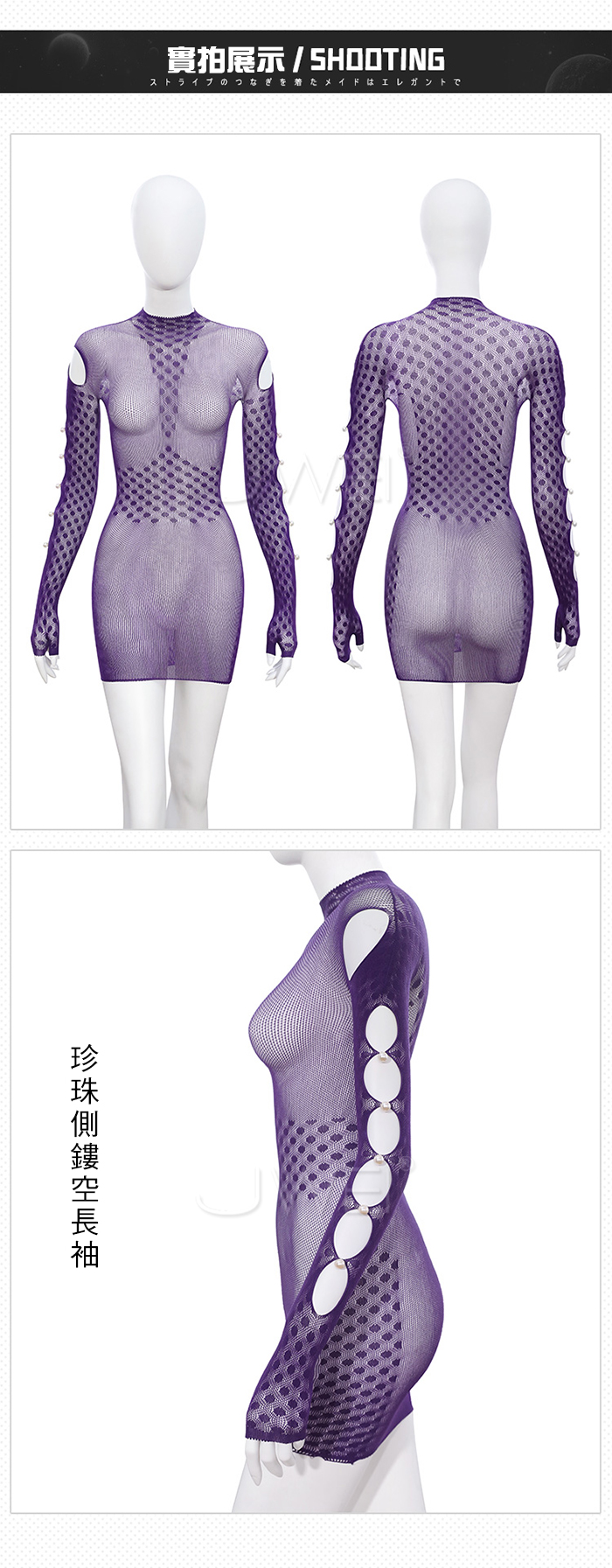 ►您現在的位置:首頁>鄰家姐姐.高智感珍珠飾側鏤空長袖半高領包臀連身網衣-紫【單件網衣】