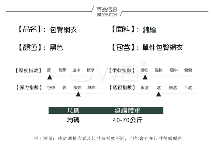 ■內容物:單件網衣 ■適穿尺寸:FREESIZE ■彈性:有 ■未撐開平量尺寸正負誤差1~2cm,1吋=2.54cm ■注意事項:基於保障消費者個人衛生,此貼身衣物恕不接受退換貨。 (如為商品本身暇疵,接受七日內換貨,請勿試穿,謝謝您)