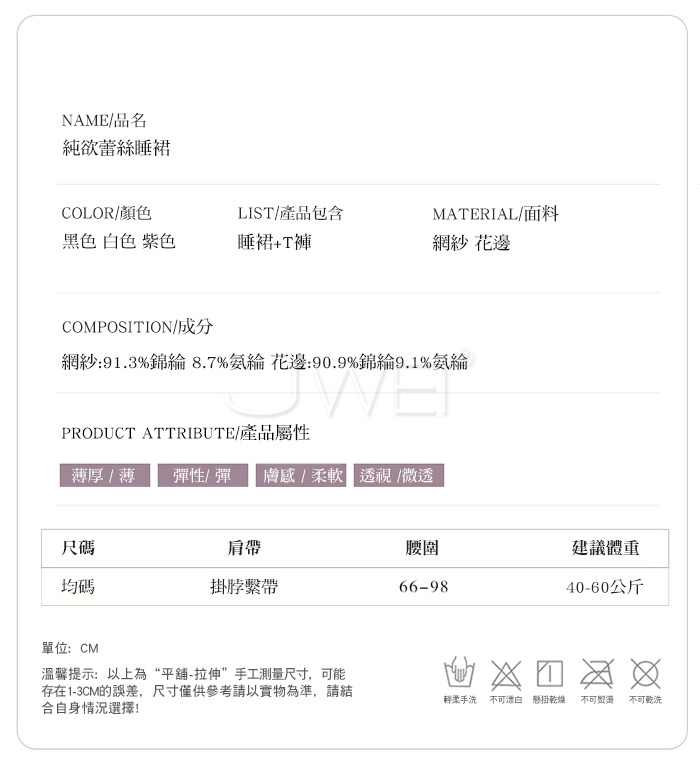 ■內容物:睡裙+T褲 ■適穿尺寸:FREESIZE ■彈性:彈 ■未撐開平量尺寸正負誤差1~2cm,1吋=2.54cm ■注意事項:基於保障消費者個人衛生,此貼身衣物恕不接受退換貨。 (如為商品本身暇疵,接受七日內換貨,請勿試穿,謝謝您)