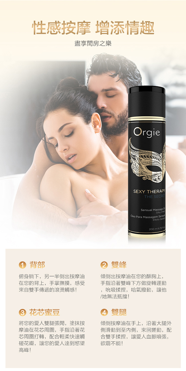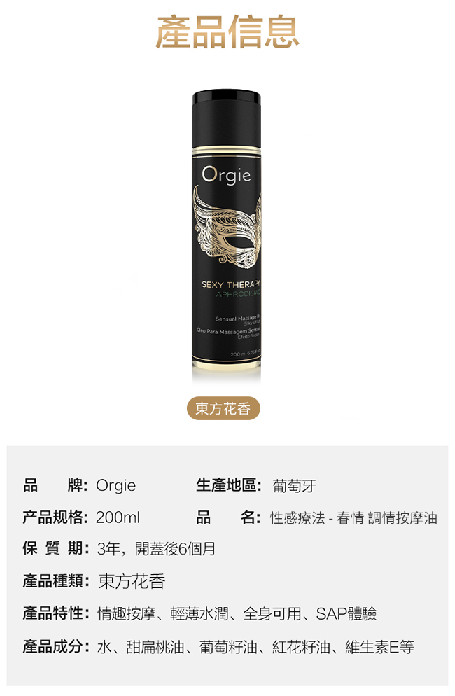 首頁>葡萄牙Orgie.Sexy Therapy MASSAGE OIL 性感療法 - 春情 調情按摩油 200ml