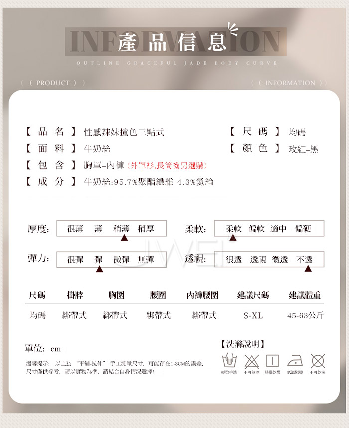 ■內容物:胸罩+內褲 ■適穿尺寸:FREESIZE ■彈性:彈 ■未撐開平量尺寸正負誤差1~2cm,1吋=2.54cm ■注意事項:基於保障消費者個人衛生,此貼身衣物恕不接受退換貨。 (如為商品本身暇疵,接受七日內換貨,請勿試穿,謝謝您)