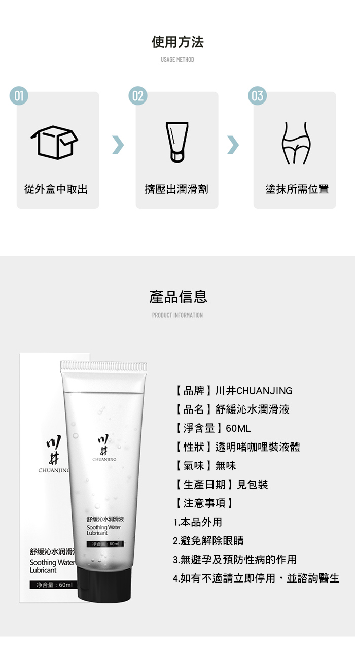 ►您現在的位置:首頁>川井.舒緩沁水玻尿酸水溶性清爽潤滑液【60ml】