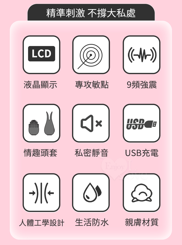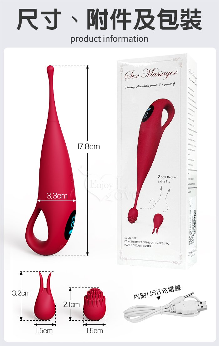 產品材質:舒適矽膠材質 主要功能:9頻聲波高頻震動,液晶顯示刺激12,000根神經,雙頭套帶來多種花樣玩法 1:9頻聲波高頻震動 2:雙頭套全身刺激 3:方便攜帶 4:科技數碼顯示 5:250毫安電池